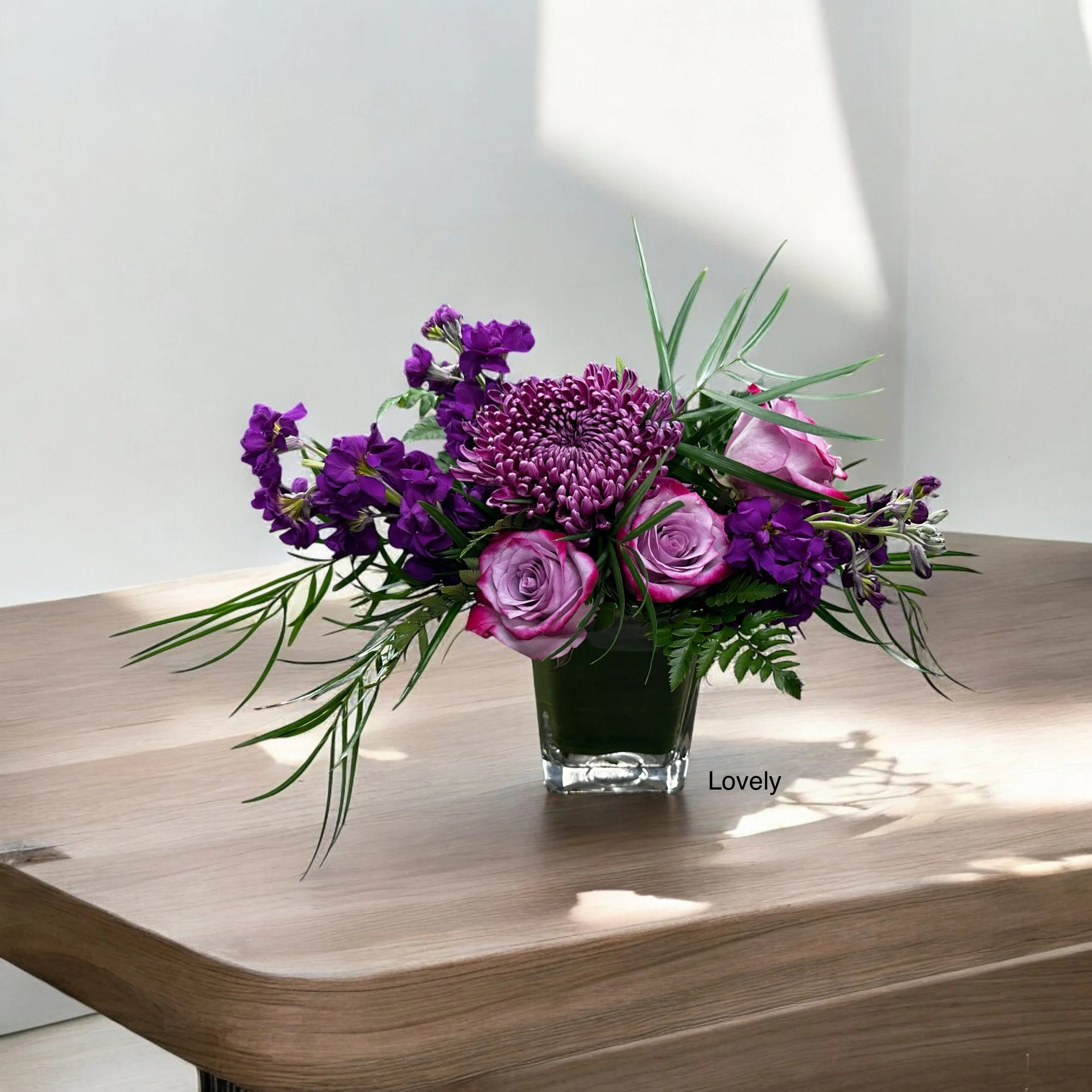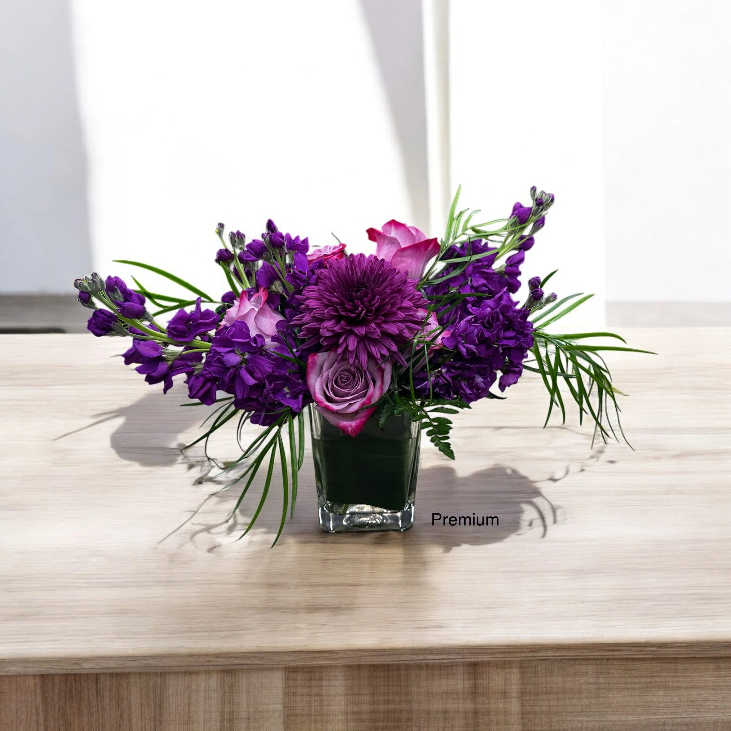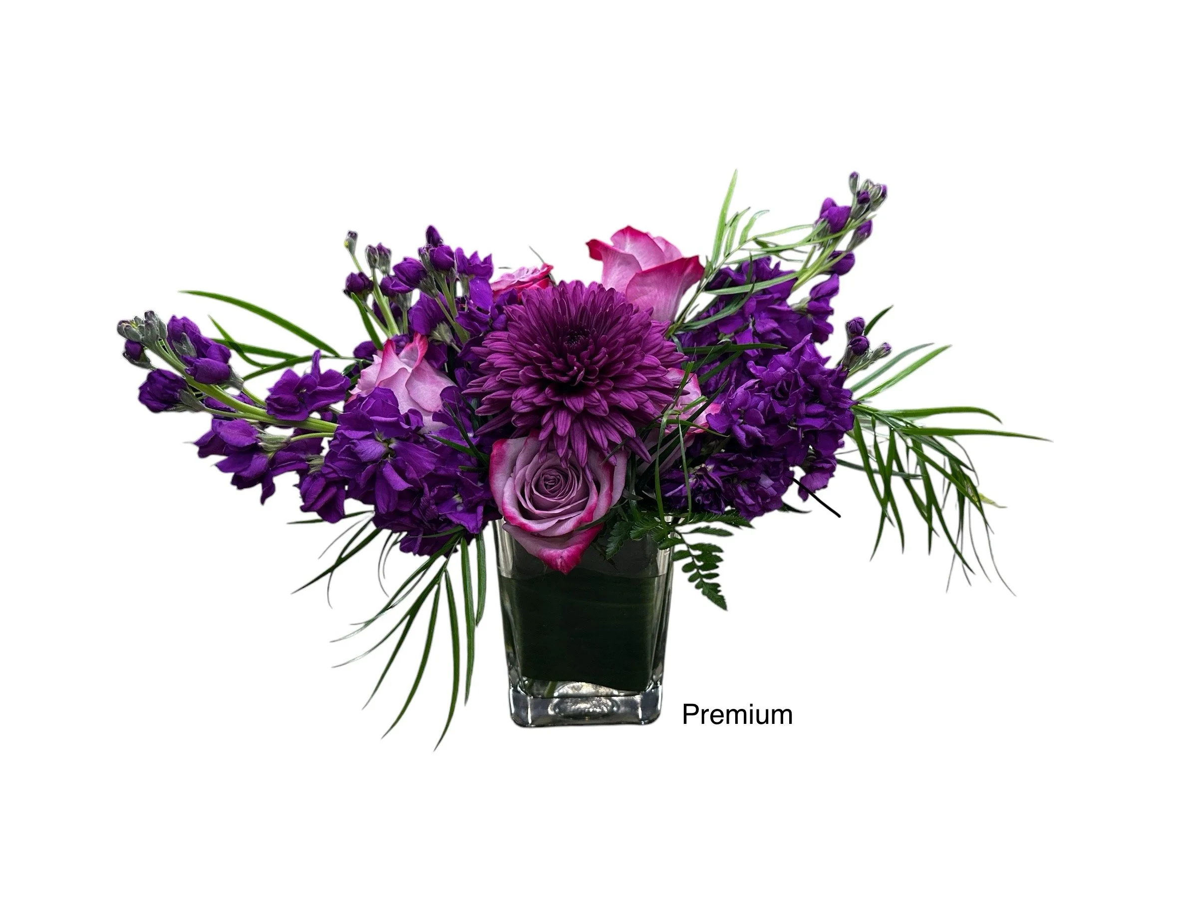 Shades of purple catch the eye in this gorgeous design. Including stems like roses, cremones, stock, and a variety of interesting foliages, all carefully designed in a glass vase. The aspidistra leaf wrapped vase adds a unique touch!