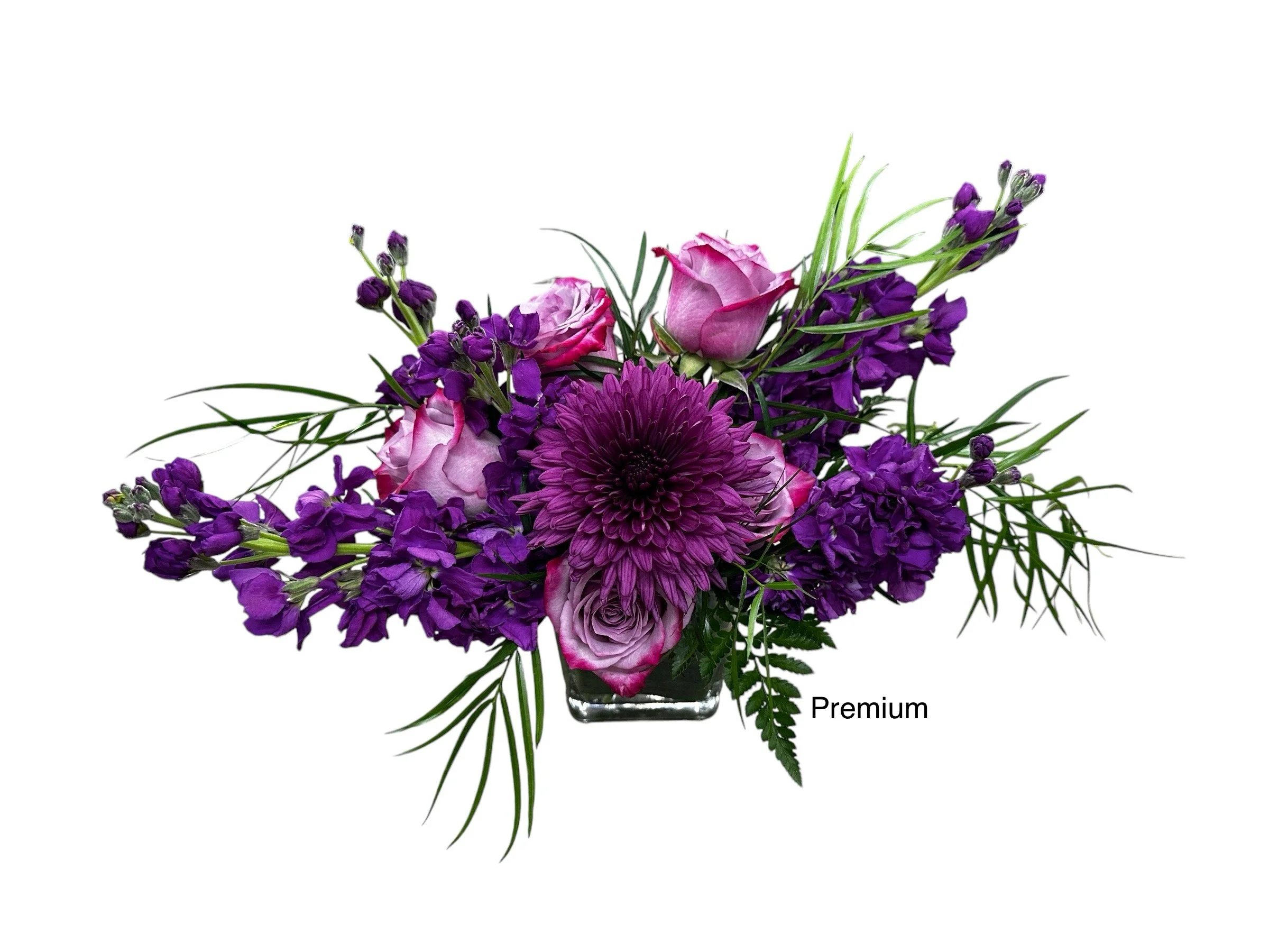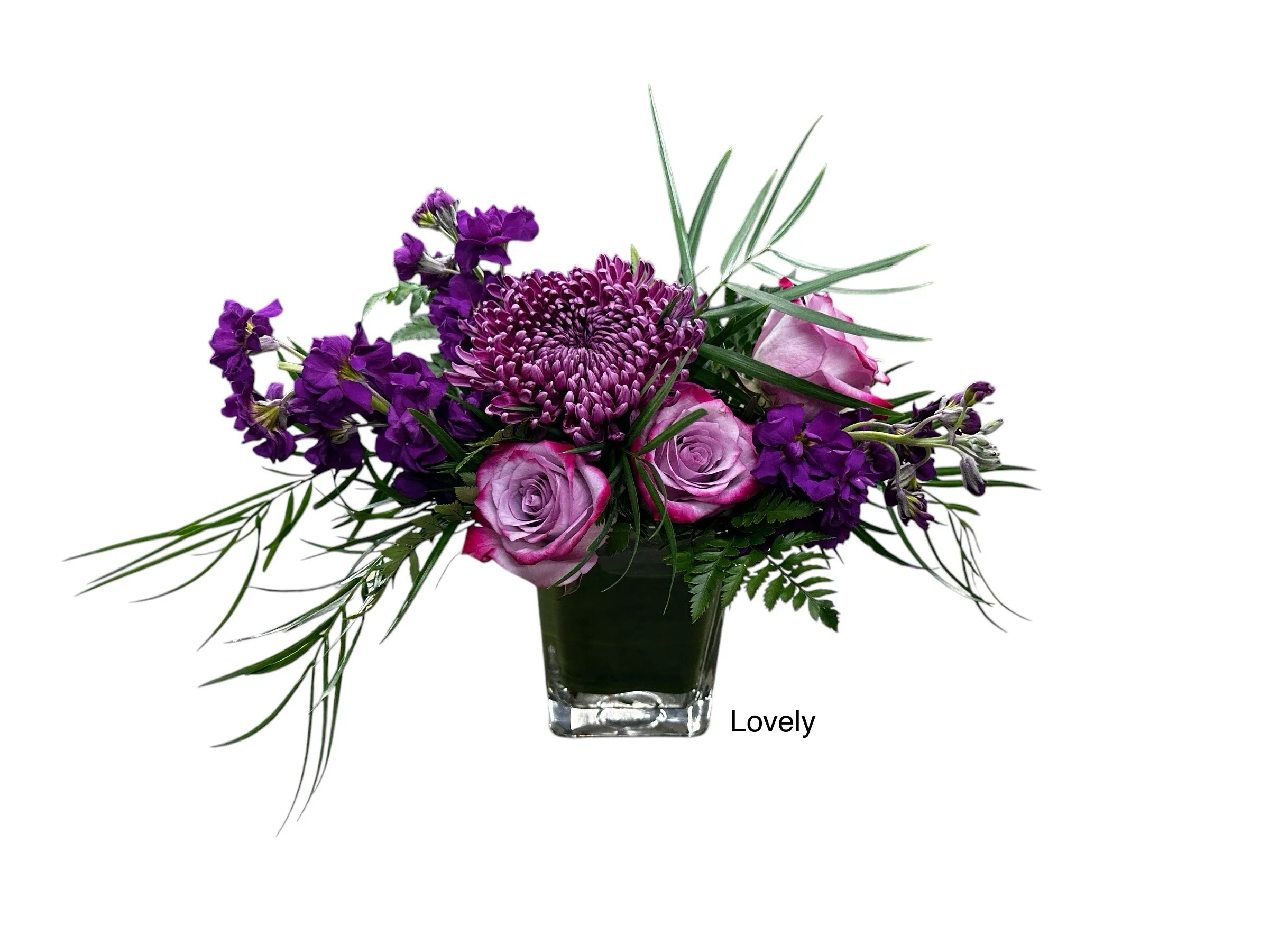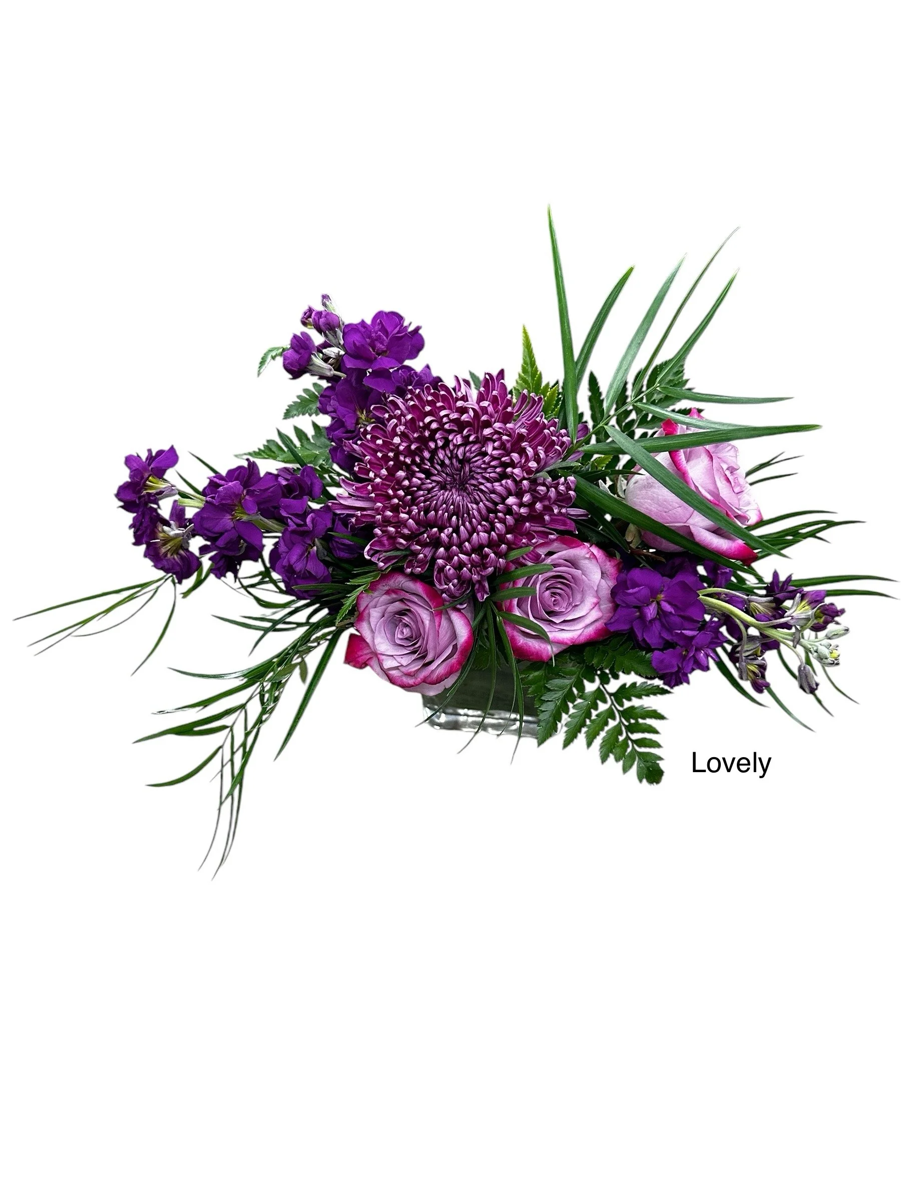Shades of purple catch the eye in this gorgeous design. Including stems like roses, cremones, stock, and a variety of interesting foliages, all carefully designed in a glass vase. The aspidistra leaf wrapped vase adds a unique touch!