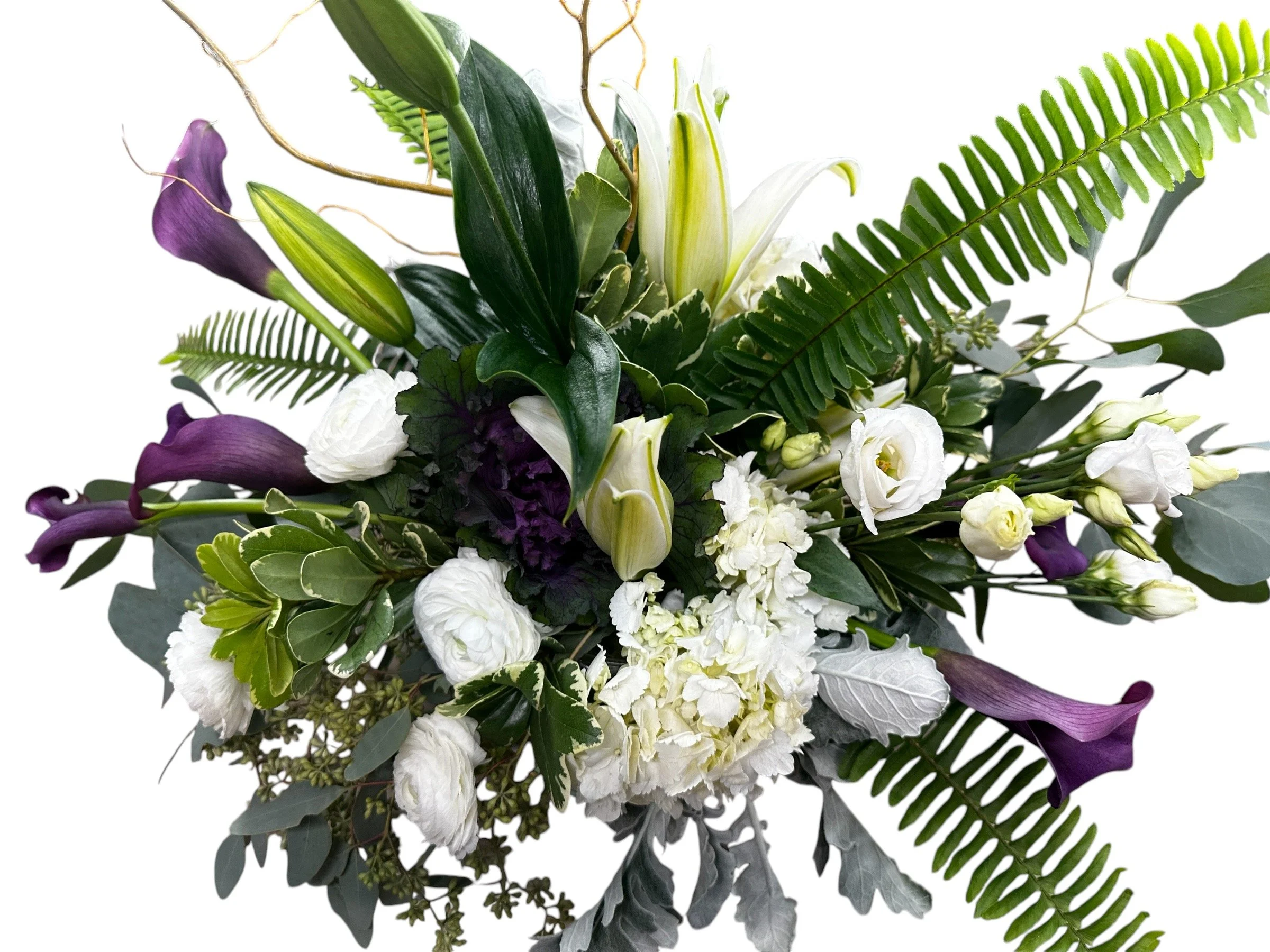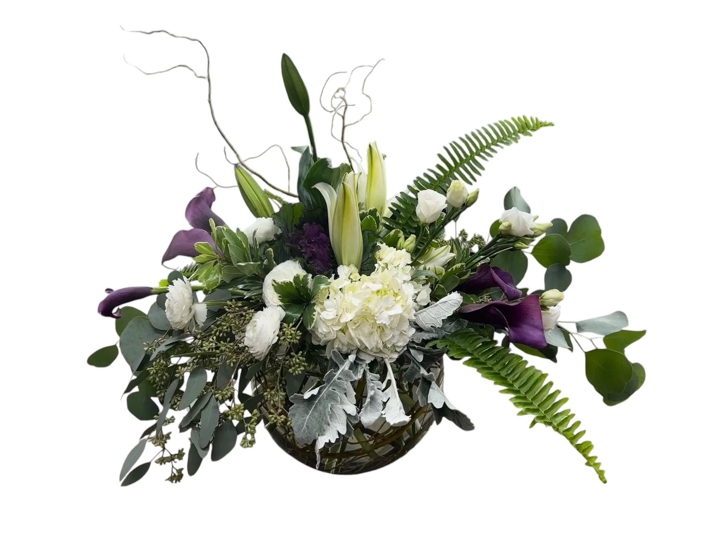 A stunning vase full of style. This glass bubble bowl style vase includes white and purple stems like lilies, mini calla lilies, lisianthus, ranunculus, hydrangeas, kale, and a variety of foliages to create texture and movement (oriental lilies may come in bud form to prolong enjoyment as they open. Some featured stems are seasonally unavailable).
