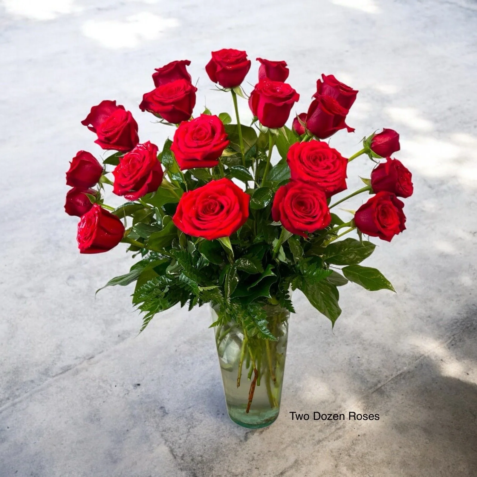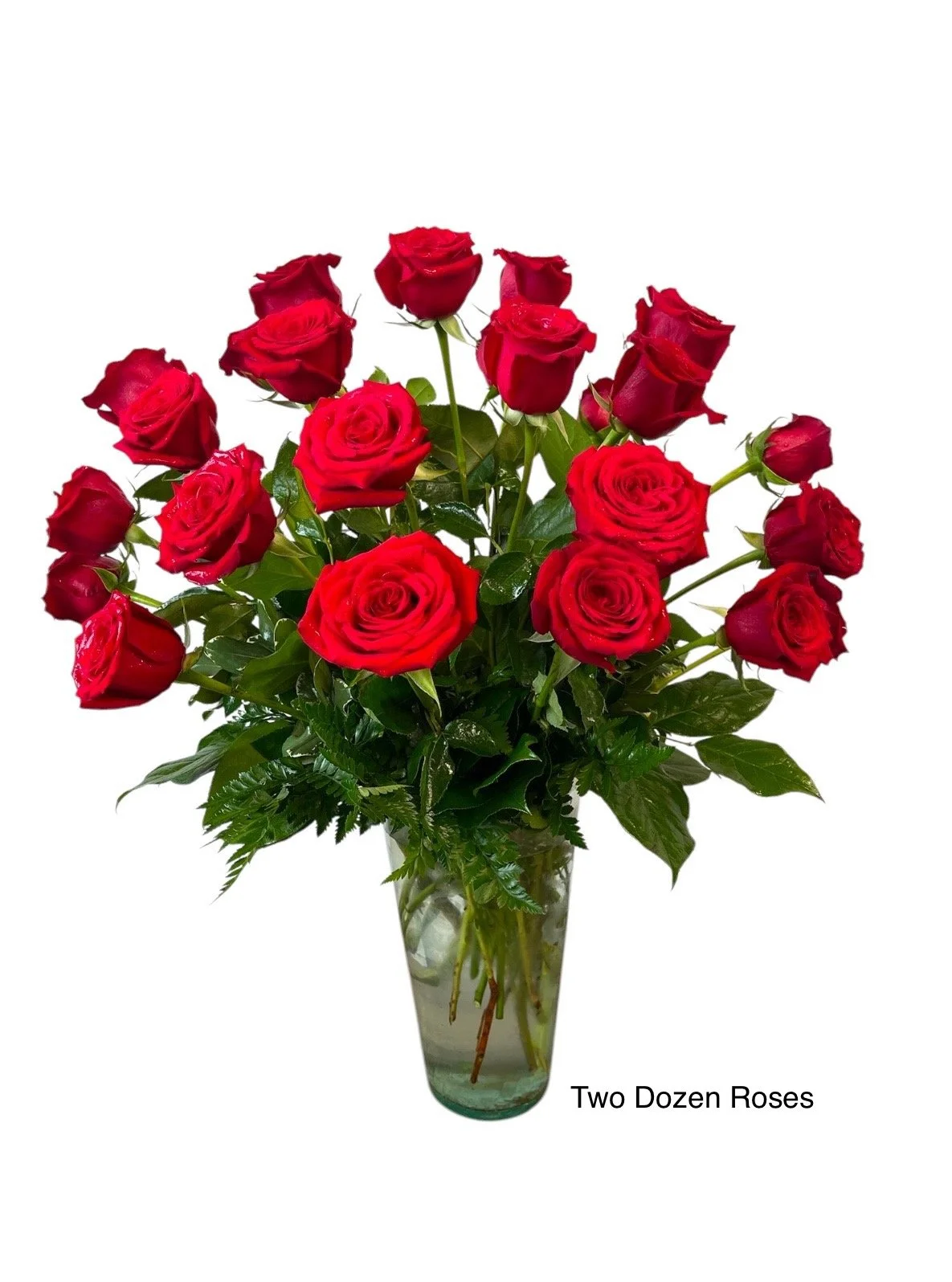 Traditionally styled and designed, this two dozen rose arrangement is always a hit. Our long lasting long stemmed red roses, accent flower (like babies breath), and assorted foliages make this a stunning vase a classic.